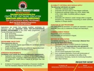 Applications are invited from suitably qualified candidates for admission into the 2025/2026 AKSU TOP-UP/CONVERSION DEGREE PROGRAMMES in the under listed programmes in the Faculty of […]