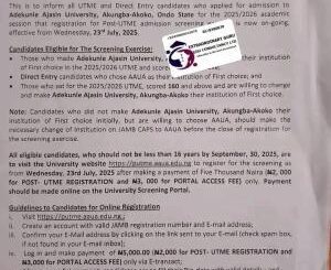 This is to inform all UTME and Direct Entry candidates who applied for admission to Adekunle Ajasin University, Akungba-Akoko, Ondo State for the 2025/2026 academic […]