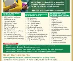 Venite University, Iloro-Ekiti, has officially opened its admission portal for the 2025/2026 academic session, calling on qualified candidates across Nigeria to apply for undergraduate programmes […]