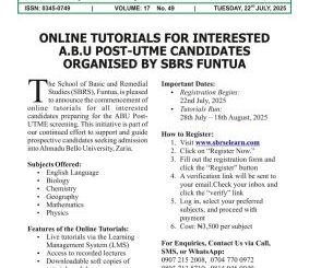 The School of Basic and Remedial Studies (SBRS), Funtua, is pleased to announce the commencement of online tutorials for all interested candidates preparing for the […]