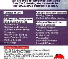 Renaissance University (RNU), Ugbawka, Enugu State, is now accepting applications for the 2025/2026 academic session into her fully accredited programs Minimum JAMB Cut-off, 150 (Applicants […]