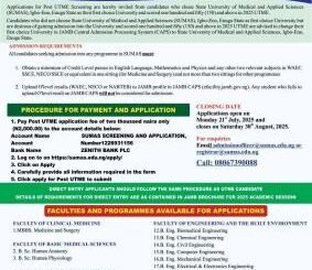 Applications for Post UTME Screening are hereby invited from candidates who chose State University of Medical and Applied Sciences (SUMAS), Igbo-Eno, Enugu State as their […]