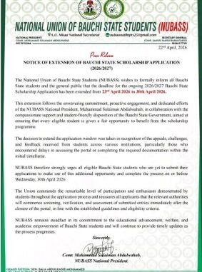 The National Union of Bauchi State Students (NUBASS) wishes to formally inform all Bauchi State students and the general public that the deadline for the ongoing 2026/2027 Bauchi State Scholarship Application has been extended from 23rd April 2026 to 30th April 2026.