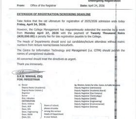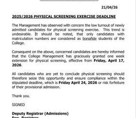 The College Management has magnanimously extended the exercise by a week from Monday April 27, 2026 with the payment of Twenty Thousand Naira (#20,000.00) a penalty […]