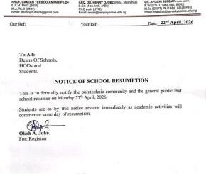 The Management of the Benue State Polytechnic wishes to formally notify the Polytechnic Community and the general public that school resumes on Monday 27th April, […]