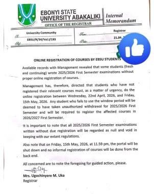 The Management of Ebonyi State University (EBSU) has observed that several students, both fresh and continuing, participated in the 2025/2026 First Semester examinations without completing the mandatory online course registration