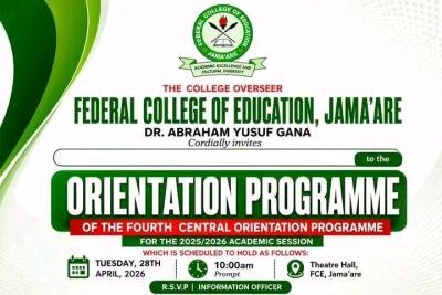 The College overseer, Federal College of Education, Jama’are, Dr Abraham Yusuf Gana, Cordially invites All to the Orientation Programme of the fourth Central Orientation Programme for the 2025/26 Academic session scheduled to hold as follows: