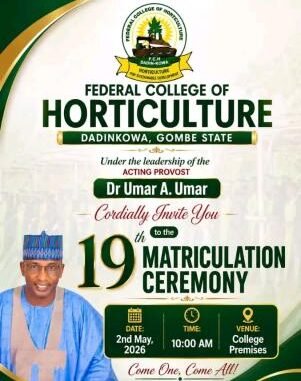 The Ag. Provost, Dr Umar A. Umar, cordially invites All to the 19th Matriculation Ceremony of Federal College of Horticulture, Dadinkowa, scheduled to hold as follows: