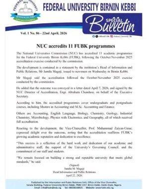 The National Universities Commission (NUC) has officially accredited 11 academic programmes at the Federal University Birnin Kebbi (FUBK). This follows a comprehensive accreditation exercise conducted by the commission during October and November 2025.