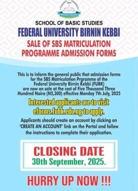 This is to inform the general public that admission forms for the School of Basic Studies Matriculation Prgramme of the Federal University Birnin Kebbi (FUBK) are now on sale at the cost of Five Thousand Three Hundred Naira (N5,300) effective Monday 7th July, 2025.