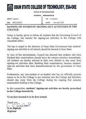 All students are hereby advised in their own interest to stay away from signing-out activities after finishing their examinations, because students’ sign-out activities had been banned/outlawed by the government of Osun State.