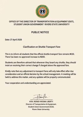 This is to inform all students that the official shuttle transport fare remains ₦150. There has been no approved increase to ₦200.