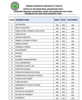 This is to inform the general public especially prospective students of the Usman Dandio University, Sokoto (UDUS) that the school management has released approved Departmental Admission Cut-off marks for the 2025/2026 Academic Session.