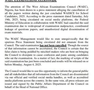 In a corresponding release dated July 20, 2025, the Federal Ministry of Education echoed WAEC’s position, warning the public against believing or spreading fabricated claims. The Ministry clarified that it had received no official report from either WAEC or NECO concerning any cancellation related to examination malpractice.