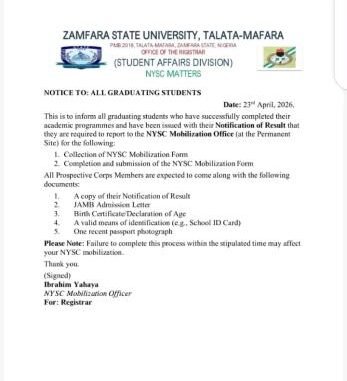 This is to inform all graduating students who have successfully completed their academic programmes and have been issued with their Notification of Result that they are required to report to the NYSC Mobilization Office (at the Permanent Site) for the following: